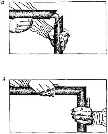 Рис. 3 б. Установка оболочек с вырезанными углами (2´45°) на колено. Надрезы проклеивают и сжимают или закрепляют с помощью зажимов