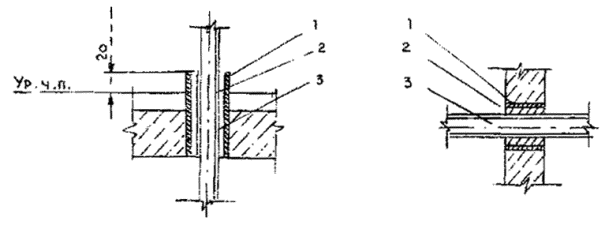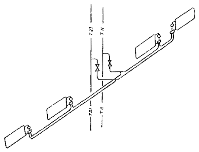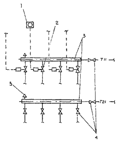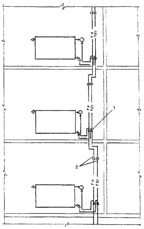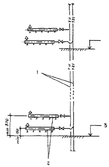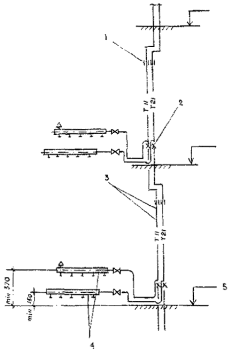 Выбор труб проводится с учетом условий работы трубопровода, давления и температуры (исходя из минимального срока службы 25 лет), места прокладки труб, назначения помещения. 2.3. МПТ должны применяться в низкотемпературных преимущественно закрытых системах водяного отопления, как правило, с искусственной циркуляцией теплоносителя. Рис. 1. Система отопления с горизонтальными двухтрубными ветками для группы паралелльно-последовательно соединенных отопительных приборов Рис. 1а. Узлы подсоединения отопительных приборов в двухтрубной системе отопления Рис. 2. Система отопления с горизонтальными однотрубными ветками для группы последовательно соединенных отопительных приборов Рис. 2а. Узлы подсоединения отопительных приборов в однотрубной системе отопления: 1 - встроенный терморегулятор; 2 - уровень чистого пола; 3 - соединительная арматура; 4 - трубопровод, проложенный в конструкции плинтуса; 5 - трубопровод, проложенный в конструкции пола Рис. 3. Распределительный коллектор систем отопления: 1 - термостатический элемент, устанавливаемый в обслуживаемом помещении; 2 - регулирующий клапан на подающем трубопроводе; 3 - распределительные коллекторы; 4 - запорная арматура; 5 - автоматический воздухоотводчик Рис. 4. Вариант подсоединения распределительных коллекторов к стоякам из металлополимерных труб: 1 - скользящая опора; 2 - неподвижная опора; 3 - стояки отопления из пластмассовых труб; 4 - распределительные коллекторы; 5 - уровень чистого пола этажа Рис. 5. Вариант подсоединения распределительных коллекторов к стоякам из стальных труб: 1 - стояки отопления из стальных труб; 2 - распределительные коллекторы; 3 - уровень чистого пола этажа 2.4. Источником тепла для систем центрального отопления с использованием металлополимерных труб могут быть: - местная котельная; - вода от ТЭЦ, приготовленная по независимой схеме. В системе теплоснабжения следует предусматривать приборы автоматического регулирования параметров теплоносителя (температура, давление) с целью защиты МПТ от превышения допустимых величин параметров теплоносителя. Не допускается применение металлополимерных труб в системах с элеваторными узлами. 2.5. Трубопроводы из МПТ следует проектировать после отсекающих задвижек, клапанов на распределительных коллекторах, Не допускается применять МПТ для защищающих трубопроводов (расширительная, предохранительная, переливная, сигнальная). 2.6. Система центрального отопления, полностью или частично выполненная из МПТ, может быть с нижней и верхней разводкой, однотрубная или двухтрубная. 2.7. В высотных зданиях необходимо зонировать систему центрального отопления, если применены трубы, выдерживающие рабочее давление 0,6 МПа. В зависимости от размера здания необходимо разделять установку на независимо регулируемые ветки, обслуживающие части здания, согласно сторонам света. 2.8. Применение МПТ наиболее эффективно в системах: - с горизонтальными двухтрубными ветками для группы параллельно-последовательно подсоединенных отопительных приборов (рис. 1, 1а); - с горизонтальными однотрубными ветками для группы последовательно подсоединенных отопительных приборов (рис. 2, 2а); - с распределительными коллекторами (рис. 3, 4, 5). 2.9. В системах с распределительными коллекторами присоединение отопительных приборов может быть осуществлено путем пролож