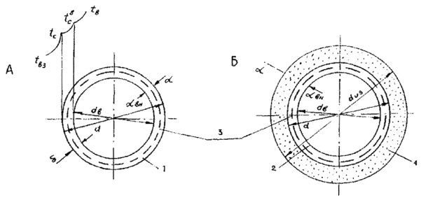 где: tcв - температура на внутренней поверхности трубопровода, °С; tс - температура на наружной поверхности трубопровода, °С; Q - тепловой поток (Вт); l - длина трубы, м; tв - температура теплоносителя, °С; tв.3 - температура воздушной среды, °С; aн - коэффициент наружной теплоотдачи, Вт/м2×°К; dн - наружный диаметр трубы, мм; l - коэффициент теплопроводности, Вт/м×°К; dв - внутренний диаметр трубы, мм; aвн - коэффициент внутренней теплоотдачи, Вт/м2×°К. При оценке возможности выпадения конденсата на поверхности трубы необходимо определить температуру наружной стенки трубы и сопоставить ее с температурой точки росы (tр)