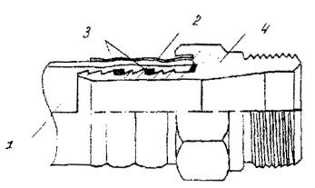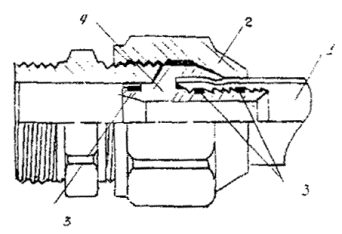 4.5.3. Необходимо предусмотреть соответствующее расположение креплений на поворотах и ответвлениях трубопровода. 4.5.4. Распределительные коллекторы и запорно-регулирующую арматуру следует закреплять с помощью самостоятельных неподвижных. Рис. 11а. Соединение с накидной обжимной гайкой: 1 - металлополимерная труба; 2 - обжимная гайка; 3 - уплотнители; 4 - соединительная вставка