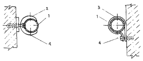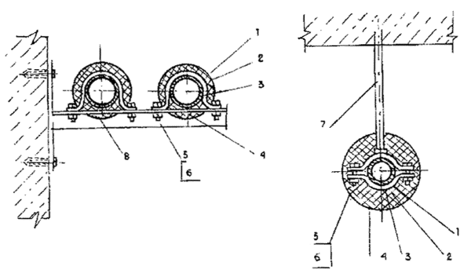 Рис. 11б. Соединение с накидной гайкой и разрезным кольцом: 1 - металлополимерная труба; 2 - обжимная гайка; 3 - разрезное обжимное упругое кольцо; 4 - соединительная вставка с наружной резьбой Рис. 11 в. Соединение с обжимной втулкой: 1 - металлополимерная труба; 2 - обжимная втулка; 3 - уплотнители; 4 - соединительная вставка креплений для устранения передачи усилий на трубопровод в процессе эксплуатации. 4.5.5. Минимальные расстояния от осей отводов и тройников до креплений следует принимать с учетом температурного изменения длины трубы. 4.5.6. Для закрепления труб следует применять изделия согласно каталогам фирм-изготовителей труб или иные опоры, применяемые для металлополимерных труб. Возможные способы крепления представлены на рис. 12 и 13. 4.6. Испытание систем отопления4.6.2. При подготовительных работах перед опрессовкой системы необходимо: - отключить (временно снять) предохранительные клапаны безопасности, регулировочные клапаны, датчики и др., если допустимое давление указанной арматуры меньше величины пробного давления по п. 4.6.1; - отключенные элементы заменить заглушками или отключающими запорными клапанами, допустимое давление для которых больше величины пробного давления; - подключить к системе манометр с точностью 0,01 МПа. 4.6.3. Систему следует заполнить водой медленно при открытых воздухоспускных устройствах во избежание образования воздушных пробок. 4.6.4. Гидравлические испытания необходимо проводить при постоянной температуре в два этапа: 1 этап - в течение 30 минут дважды поднимать давление до расчетной величины через каждые 10 минут. В последующие 30 минут падение давления в системе не должно превышать 0,06 МПа; 2 этап - в последующие 2 часа падение давления (от давления, достигнутого на 1-м этапе) не должно быть больше чем на 0,02 МПа. Рис. 12. Крепление труб к стенам и перегородкам: 1 - труба; 2 - фиксатор; 3 - хомут; 4 - шуруп Рис. 13. Крепление магистральных трубопроводов: 1 - хомут; 2 - труба; 3 - резиновая прокладка; 4 - теплоизоляция; 5 - болт; 6 - гайка; 7 - подвеска; 8 - кронштейн 4.7. Ремонтные работы4.7.1. Слесари-сантехники, производящие ремонт, должны быть ознакомлены со свойствами металлополимерных труб и технологией их обработки. 4.7.2. При замене труб во время ремонта не допускается ставить трубы меньшего диаметра. 4.7.3. В случае повреждения участка трубопровода целесообразно вырезать поврежденный участок. Замена производится с помощью отрезка трубы нужной длины, соединяемого с трубопроводом со специальными соединительными деталями. Поврежденный участок трубы соединяется при помощи 2-х соединений с накидной обжимной гайкой через ниппель с уплотнением резьбовой части или 2-стороннее соединение с обжимной гайкой и разрезным кольцом без уплотнения резьбовой части. 4.7.4. При проведении сварочных или иных огневых работ в местах возможного термического или механического повреждения труб необходимо ставить ограждения. 4.7.5. Для очистки наружной поверхности труб следует применять материал, исключающий механические повреждения. 4.7.6. При замерзании системы наличие пробок в трубе можно определять по местному увеличению диаметра (расширению) трубы или по слою инея и льда на поверхности. Прогревать трубу следует теплым воздухом или горячей водой с температурой до 90°С. Категорически запрещается использовать открытое пламя и обстукивать трубы молотком. 