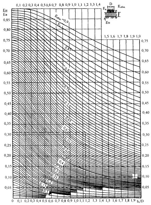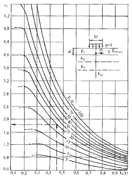 3.27. Общий расчетный модуль упругости конструкции определяют с помощью номограммы рис. 3.1, построенной по решению теории упругости для модели многослойной среды. Приведение многослойной конструкции к эквивалентной однослойной ведут послойно, начиная с подстилающего грунта. Рис. 3.1. Номограмма для определения общего модуля упругости двухслойной системы Еобщ 3.28. Расчетные значения модулей упругости грунтов и материалов допускается принимать в соответствии с указаниями Приложений 2 и 3. Значения модулей упругости материалов, содержащих органическое вяжущее, необходимо принимать во всех климатических зонах при температуре +10 °С по Приложению 3, табл. П.3.2. 3.29. Расчет по допустимому упругому прогибу (по требуемому модулю деформации) ведут в следующей последовательности: 1. Определяют требуемый минимальный общий модуль конструкции по формуле 3.10. 2. Назначают модули и предварительно толщины слоев конструкции (кроме толщины основания). 3. Выполняя расчет конструкции сверху вниз, определяют с помощью номограммы рис. 3.1, требуемые модули на поверхности каждого конструктивного слоя. 4. Выполняя расчет конструкции снизу вверх, определяют толщину основания (при заданном его модуле), обеспечивающую необходимый модуль на поверхности основания, полученный при расчете сверху. Расчет по условию сдвигоустойчивости подстилающего грунта и малосвязных конструктивных слоев