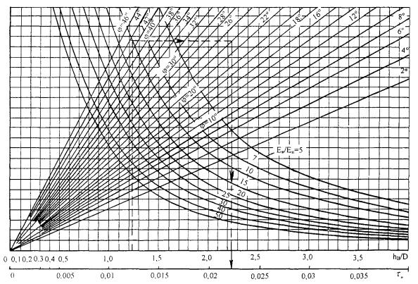 3.34. Действующие в грунте или в песчаном слое активные напряжения сдвига (Т) вычисляют по формуле: где р - расчетное давление от колеса на покрытие. Примечание: При пользовании номограммой для определения Рис. 3.2. Номограмма для определения активного напряжения сдвига от временной нагрузки в нижнем слое двухслойной системы (при hв/D = 0¸2,0) Рис. 3.3. Номограмма для определения активного напряжения сдвига от временной нагрузки в нижнем слое двухслойной системы (при hв/D = 0¸4,0) Tnp = сNkд + 0,1gсрzопtgjСТ, (3.14) где сN - сцепление в грунте земляного полотна (или в промежуточном песчаном слое), МПа, принимаемое с учетом повторности нагрузки (Приложение 2, табл. П.2.6 или табл. П.2.8); kд - коэффициент, учитывающий особенности работы конструкции на границе песчаного слоя с нижним слоем несущего основания. При устройстве нижнего слоя из укрепленных материалов, а также при укладке на границе «основание - песчаный слой» разделяющей геотекстильной прослойки, следует принимать значения kд равным: - 4,5 - при использовании в песчаном слое крупного песка; - 4,0 - при использовании в песчаном слое песка средней крупности; - 3,0 - при использовании в песчаном слое мелкого песка; - 1,0 - во всех остальных случаях. zоп - глубина расположения поверхности слоя, проверяемого на сдвигоустойчивость, от верха конструкции, см; gср - средневзвешенный удельный вес конструктивных слоев, расположенных выше проверяемого слоя, кг/см3; jСТ - расчетная величина угла внутреннего трения материала проверяемого слоя при статическом действии нагрузки. 3.36. Во всех случаях в качестве расчетных значений угла внутреннего трения грунта и малосвязных слоев используют его значения, отвечающие расчетному суммарному числу воздействия нагрузки за межремонтный срок SNp. Эту величину устанавливают по формуле (3.6). Входящую в формулу (3.6) величину расчетных дней в году, соответствующих расчетному состоянию прочности и деформируемости конструкции Трдг определяют по специальным региональным справочным данным. Для условий Российских регионов следует использовать данные справочного Приложения 6 (рис. П.6.1 и табл. П.6.1). 3.37. Расчет дорожной одежды по сопротивлению сдвигу в грунте земляного полотна, а также в песчаных материалах промежуточных слоев дорожных одежд ведут в следующей последовательности: а) по табл. П.3.2 назначают расчетные модули упругости для слоев из асфальтобетона, соответствующие максимально возможным температурам в ранний весенний (расчетный) период (в соответствии с указаниями п. 3.33); назначают по таблицам П.2.6-П.2.8 Приложения 2 (с учетом расчетной влажности и общего числа воздействия нагрузки) расчетные прочностные характеристики j и с грунта земляного полотна и песка промежуточного слоя одежды (если таковой имеется) с учетом требований п. 3.36. Остальные расчетные характеристики грунта и материалов остаются теми же, что и в расчете по упругому прогибу; б) по рис. 3.2 или рис. 3.3