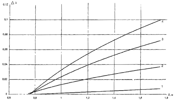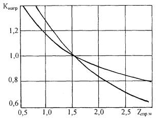 Примечание. В восточных районах II-III дорожно-климатических значения lдоп следует увеличивать на 20-40 % (большие значения для облегченных и переходных дорожных одежд). КУГВ - коэффициент, учитывающий влияние расчетной глубины залегания уровня грунтовых или длительно стоящих поверхностных вод (Ну) (рис. 4.1); при отсутствии влияния грунтовых или длительно стоящих поверхностных вод следует принимать: для супеси тяжелой и пылеватой и суглинка КУГВ = 0,53; для песка и супеси легкой и крупной КУГВ = 0,43; Кпл - коэффициент, зависящий от степени уплотнения грунта рабочего слоя (табл. 4.4); Кгр - коэффициент, учитывающий влияние гранулометрического состава грунта основания насыпи или выемки (табл. 4.5); Кнагр - коэффициент, учитывающий влияние нагрузки от собственного веса вышележащей конструкции на грунт в промерзающем слое и зависящий от глубины промерзания (рис. 4.2); Квл - коэффициент, зависящий от расчетной влажности грунта (табл. 4.6). 4.5. Если данные натурных наблюдений отсутствуют, глубину промерзания дорожной конструкции допускается определять по формуле: zпp = zпp(cp) × 1,38, (4.3) где zпp(cp) - средняя глубина промерзания для данного района, устанавливаемая при помощи карт изолиний (рис. 4.4). 4.6. При глубине промерзания дорожной конструкции zпp до 2 м lпуч ср устанавливают по графикам рис. 4.3. При zпp от 2,0 до 3,0 м lпуч ср вычисляют по формуле: lпуч ср = lпуч ср 2,0 × [a + b (zпp - c)], (4.4) где lпуч ср 2,0 - величина морозного пучения при zпp = 2,0 м; а = 1,0; b = 0,16; с = 2,0 при 2,0 < zпp < 2,5; a = 1,08; b = 0,08; с = 2,5 при 2,5 < zпp < 3,0. Рис. 4.1. Зависимость коэффициента КУГВ от расстояния от низа дорожной одежды до расчетного УГВ или УПВ: 1 - супесь тяжелая и тяжелая пылеватая, суглинок; 2 - песок, супесь легкая и легкая крупная Рис. 4.2. Зависимость коэффициента Кнагр от глубины промерзания zпр от поверхности покрытия: 1 - супесь тяжелая и пылеватая; суглинок; 2 - песок; супесь легкая, крупная 4.7. Если при расчетном сроке службы до 10 лет полученная величина возможного пучения будет превышать требуемую (табл. 4.3), а при сроке службы более 10 лет будет превышать 80 % от требуемой, необходимо рассмотреть вариант устройства морозозащитного слоя. В этом случае предварительно определяют ориентировочно требуемую толщину морозоустойчивой конструкции дорожной одежды, используя графики рис. 4.3. Для этого, зная допустимую величину морозного пучения lдоп, рассчитывают среднюю величину морозного пучения lпуч.ср по формуле: lпуч.ср = lдоп/КУГВ Кпл Кгр Кнагр Квл. (4.5.) Затем по графику рис. 4.3. в соответствии с группой грунта по степени пучинистости определяют hoд. Таблица 4.4