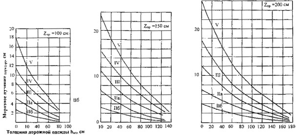 3.4 находят значение c) вычисляют предельное растягивающее напряжение по формуле (3.18). В пакете асфальтобетонных слоев за предельное растягивающее напряжение RN принимают значение, отвечающее материалу нижнего слоя асфальтобетонного пакета; d) проверяют условие (3.15) и при необходимости корректируют конструкцию. 4. ПРОВЕРКА ДОРОЖНОЙ КОНСТРУКЦИИ НА МОРОЗОУСТОЙЧИВОСТЬ4.1. В районах сезонного промерзания грунтов земляного полотна при неблагоприятных грунтовых и гидрологических условиях, наряду с требуемой прочностью и устойчивостью должна быть обеспечена достаточная морозоустойчивость дорожных одежд. С этой целью применяют различные специальные мероприятия: - использование непучинистых или слабопучинистых грунтов (табл. 4.1, 4.2.) для сооружения верхней части земляного полотна, находящегося в зоне промерзания; - осушение рабочего слоя земляного полотна (см. раздел 5), в том числе устройство дренажа для увеличения расстояния от низа дорожной одежды до уровня подземных вод; устройство гидроизолирующих или капилляропрерывающих прослоек для перехода от 2-ой или 3-й схемы увлажнения рабочего слоя земляного полотна к 1-й схеме; - устройство морозозащитного слоя из непучинистых минеральных материалов, в т.ч. укрепленных малыми дозами минеральных или органических вяжущих; - устройство теплоизолирующих слоев, снижающих глубину или полностью исключающих промерзание грунта под дорожной одеждой; - устройство основания дорожной одежды из монолитных материалов (типа тощего бетона или других зернистых материалов, обработанных минеральным или органическим вяжущим). 4.2. Конструкцию считают морозоустойчивой, если соблюдено условие lпуч £ lдоп, (4.1) где lпуч - расчетное (ожидаемое) пучение грунта земляного полотна; lдоп - допускаемое для данной конструкции пучение грунта (табл. 4.3). 4.3. Расчет на морозоустойчивость необходимо выполнять для характерных участков или групп характерных участков дороги, сходных по грунтово-гидрологическим условиям, имеющим одну и ту же конструкцию дорожной одежды и схему увлажнения рабочего слоя земляного полотна. 4.4. При предварительной проверке на морозоустойчивость величину возможного морозного пучения следует определять по формуле: lпуч = lпуч срКУГВ Кпл КгрКнагрКвл, (4.2) где lпуч ср - величина морозного пучения при осредненных условиях, определяемая по рис. 4.4 в зависимости от толщины дорожной одежды (включая дополнительные слои основания), группы грунта по степени пучинистости (табл. 4.1) и глубины промерзания (zпp); Таблица 4.1 Классификация грунтов по степени пучинистости при замерзании (СНиП 2.05.02-85, прил. 2 табл. 6)