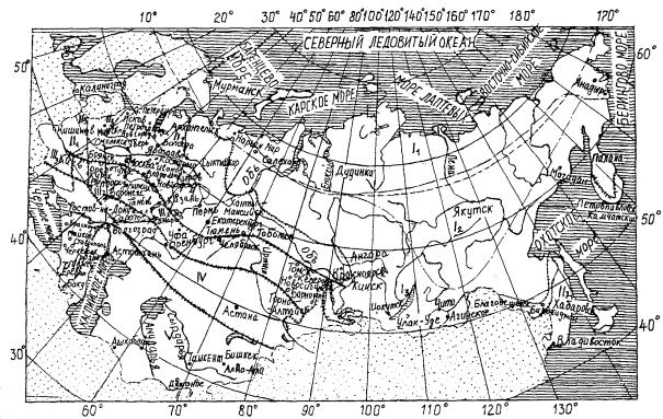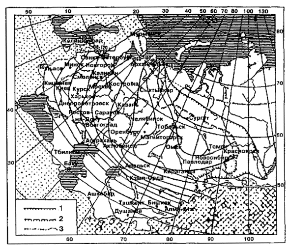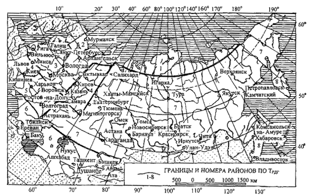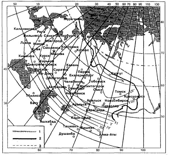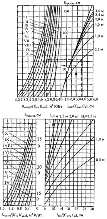 4.8. Уточненный расчет толщины морозозащитного слоя (hмз) выполняют по термическому сопротивлению конструкций. Для этого необходимо иметь следующие исходные данные: - географическое местоположение рассматриваемого участка дороги; - конструкцию дорожной одежды (наименование и толщина слоев), необходимая по условиям прочности и дренирования; Рис. 4.3. Графики для определения осредненной величины морозного пучения 1пуч.ср. Примечания: 1. Кривую (II - V) выбирают в соответствии с табл. 4.2. 2. КривуюIIа выбирают при 2-й и 3-й схеме увлажнения рабочего слоя, кривую IIб - при 1-й схеме увлажнения. Рис. 4.4. Карта изолиний глубины промерзания Znp(cp) грунтов на территории СНГ: 1 - граница сплошного распространения вечномерзлых грунтов; 2 - то же, островного; 3 - границы стран СНГ - схему увлажнения рабочего слоя земляного полотна (1, 2 или 3) и расчетную глубину залегания подземных вод от поверхности покрытия; - наименование грунтов земляного полотна; - расчетный срок службы дорожной одежды. 4.9. Толщину морозозащитного слоя hмз определяют по формуле: hмз = (Rод(тр) - Rод(о))lмз, (4.6) где Rод(о) - термическое сопротивление рассматриваемой конструкции дорожной одежды, [м2К/Вт]; Rод(тр) - требуемое в данных условиях термическое сопротивление дорожной одежды, [м2К/Вт]; lмз - коэффициент теплопроводности морозозащитного слоя, равный среднеарифметическому значению коэффициентов теплопроводности материала слоя в талом и мерзлом состояниях, Вт/(мК). При отсутствии фактически замеренных значений в расчет допускается включать табличные значения lмз (табл. П.5.1). Rод(тр) определяют в зависимости от номера изолинии на карте (рис. 4.5), соответствующей географическому положению рассматриваемого участка дороги. При расположении участка между изолиниями определяют два значения Rод(тр) и вычисляют два значения hмз соответствующих этим изолиниям. Искомую толщину морозозащитного слоя определяют методом интерполяции в зависимости от расстояния от рассматриваемого участка дороги до соседних изолиний. Рис. 4.5. Карта с изолиниями для определения требуемых значений термического сопротивления дорожной одежды: I-X - номера изолиний; 1 - граница сплошного распространения вечномерзлых грунтов; 2 - то же, островного; 3 - Северный полярный круг 4.10. Теоретическое сопротивление дорожной одежды R(од)о вычисляют по формуле: где nод - число конструктивных слоев дорожной одежды без морозозащитного слоя; hод(i) - толщина i-го слоя, м; lод(i) - коэффициент теплопроводности отдельных слоев в мерзлом состоянии, Вт/(мК). 4.11. Величину требуемого термического сопротивления Rод(тр) вычисляют по формуле: Rод(тр) = Rпp × Код × Кувл × d, [м2 К/Вт], (4.8) где Rпp - приведенное термическое сопротивление, определяемое при помощи номограммы (см. п. 4.12); Код - коэффициент, учитывающий срок службы дорожной одежды, между капитальными ремонтами (табл. 4.7); Кувл - коэффициент, учитывающий схему увлажнения рабочего слоя земляного полотна, принимаемый при 2-й и 3-й схемах увлажнения равным единице, а при 1-ой схеме увлажнения - по табл. 4.8; d - понижающий коэффициент, принимаемый для II1, II3 и II5 дорожно-климатических подзон равным 1,0; для II2, II4 и II6, подзон равным 0,95; для III-ей дорожно-климатической зоны равным 0,90; для IV дорожно-климатической зоны равным 0,85 (схему дорожно-климатических зон см. Приложение 2). 4.12. Rпp определяют с помощью номограммы (рис. 4.6) методом итераци