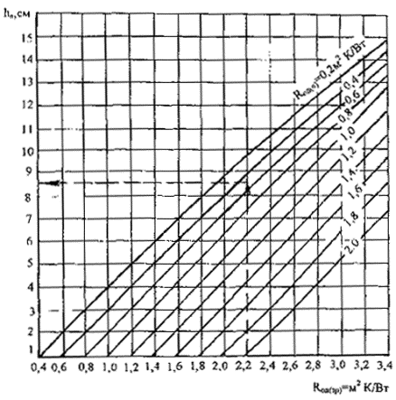 Примечание. При промежуточных значениях толщины дорожной одежды следует принимать значение Ср по интерполяции соответствующих величин. 4.14. Расчет толщины теплоизолирующего слоя осуществляется также как и морозозащитного. В расчет следует включать толщину дорожной одежды, необходимую по условиям обеспечения прочности и дренирования, а также значения показателя пучинистости грунта Спуч (табл. 4.11); толщину теплоизолирующего слоя следует определять по графику (рис. 4.7) в зависимости от Rод(тр) и Rод(о). Рис. 4.7. График для определения необходимой толщины теплоизолирующего слоя из пенопласта Таблица 4.11
