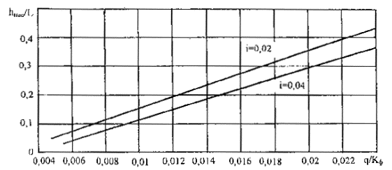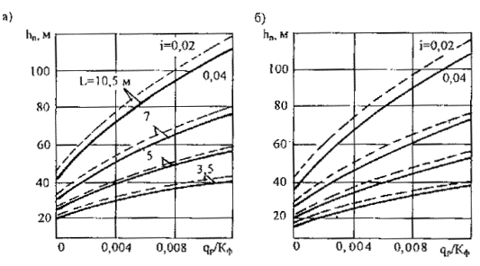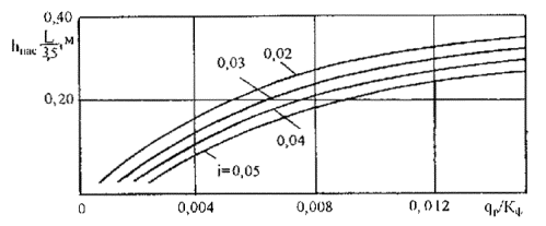 3. По номограмме рис. 5.4 по величине qp/Кф = 0,0056/1,2 = 0,0047 находят 2 значения hп: для L = 5,0 м и L = 3,5 м. По методу интерполяции hп = 0,40 м.
