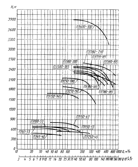 Примечания: 1. Параметры насосов с давлением 17,6 МПа (180 кгс/см2) и выше указаны без учета отбора воды от промежуточной ступени насоса. 2. Параметры насоса ПЭ 580-185 .при подаче 0,139 м3/с (500 м3/ч) достигаются обточкой рабочих колес. 3. В скобках указаны типоразмеры насосов, действующих до введения настоящего стандарта. Рабочие части характеристик Q - H