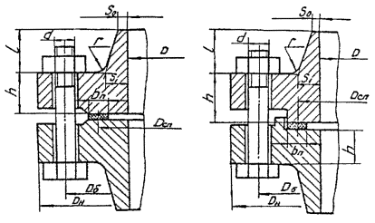 Дата введения 01.07.89 Настоящий руководящий документ устанавливает нормы и методы расчета на прочность и герметичность фланцевых соединений сосудов и аппаратов из стали, работающих в химической, нефтехимической и смежных отраслях промышленности в условиях воздействия статических и повторностатических нагрузок. Допускается применять настоящий РД для расчета фланцевых соединений трубопроводов и штуцеров при условии выполнения п.1.3. Руководящий документ применим при соблюдении требований ОСТ 26-291. 1. ОБЩИЕ ТРЕБОВАНИЯ1.1. Термины и условные обозначения соответствующих им физических величин приведены в обязательном приложении 1. 1.2. Типы фланцевых соединений приведены на черт. 1-4*. Пределы применения типов фланцевых соединений приведены в справочном приложении 5. *Чертеж не определяет конструкцию. 1.3. Расчетные формулы настоящего стандарта применимы при
