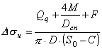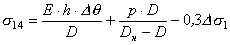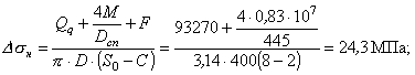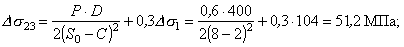 Ds21=Dsн+Ds1= 24,3 + 104 = 128,3 МПа; Ds22=Dsн-Ds1= 24,3 + 104 = 128,3 МПа; 6.5. Окружные напряжения в обечайке на наружной внутренней поверхностях при затяжке, МПа: s23 = 0,3×s1 = 0,3×353,6 = 106,1 МПа; s24 = -0,3×s1= -0,3×356,6 = -106,1 МПа. 6.6. Приращение окружных напряжений в обечайке на наружной и внутренней поверхностях в рабочих условиях: