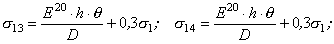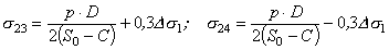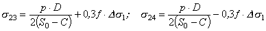 для фланцев по черт. 1 в сечении S0 Ds23=0,3¦×s1; Ds24=-0,3¦×s1; для фланцев по черт. 2, 3, 4 Ds23=0,3s1; Ds24=-0,3s1; 8.6. Приращения окружных напряжений в обечайке (втулке) на наружной и внутренней поверхностях в рабочих условиях, МПа: для фланцев по черт. 1 в сечении S1