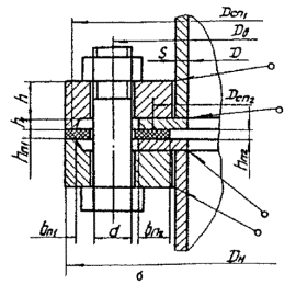 где Lб= Lб0+0,28d - для болта, Lб= Lб0+0,56d - для шпильки, fб - принимается по табл. 5. 3.5. Податливость зажимов для фланцев по черт. 4, мм/Н