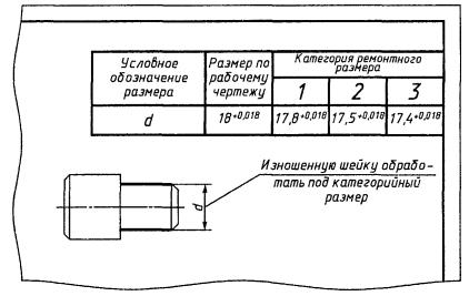значениями, например Æ18+0018, Æ 5.6 На ремонтных чертежах поверхности, подлежащие обработке при ремонте, выполняют сплошной толстой основной линией, остальные части изображения - сплошной тонкой линией (рисунок 1). Примечание - Приведенные в настоящем стандарте рисунки выполнены с полнотой, необходимой для иллюстрации изложенных в стандарте правил, и не должны рассматриваться как примеры полного оформления соответствующих чертежей. Рисунок 1 Если у отдельных элементов ремонтируемого изделия меняется конфигурация, то измененную часть показывают сплошной толстой основной линией, а неизменную часть - сплошной тонкой линией (рисунок 2). Рисунок 2 5.7 На чертежах изделия, ремонтируемого сваркой, пайкой, нанесением металлопокрытий и т.п., рекомендуется выделять соответствующий участок изделия, подлежащий ремонту (рисунок 3). Рисунок 3 5.8 При ремонте изделия наплавкой, заливкой (при помощи сварки, пайки и т.п.) на ремонтном чертеже указывают наименование, марку, размеры материала, используемого при ремонте, а также обозначение стандарта на материал (рисунок 4). Рисунок 4 5.9 Если при ремонте изделия удаляют изношенную часть и заменяют ее новой (рисунок 5), то удаляемую часть изображают тонкой штрих-пунктирной линией с двумя точками (рисунок 6). Новую часть выполняют на самостоятельном ремонтном чертеже. Рисунок 5 Рисунок 6 5.10 На ремонтном чертеже изделия, для которого установлены пригоночные размеры, при необходимости, указывают установочные базы для пригонки «по месту». 5.11 На ремонтных чертежах категорийные и пригоночные размеры, а также размеры изделия, ремонтируемого снятием минимально необходимого слоя материала, проставляют буквенными обозначениями, а их числовые значения и другие данные указывают на полках линий-выносок (рисунок 7) или в таблице (рисунок 8). Рисунок 7 Рисунок 8 5.12 На ремонтных чертежах в сопряженных изделиях с категорийными размерами сохраняется характер сопряжения (квалитеты точности, посадки, шероховатость и др.), предусмотренный в рабочих чертежах. 5.13 На ремонтных чертежах изделий для определения способа ремонта помещают технологические указания, которые являются единственными для восстановления эксплуатационных характеристик изделия. Технологические требования, относящиеся к отдельному элементу изделия, помещают на ремонтном чертеже, как правило, рядом с соответствующим элементом или участком изделия. Эти требования допускается не указывать, если они изложены в руководстве по ремонту или в технических условиях на ремонт. 5.14 Надписи, технические требования и таблицы на ремонтных чертежах выполняют в соответствии с требованиями ГОСТ 2.316. 5.15 На ремонтном чертеже допускается указывать одновременно несколько вариантов ремонта одних и тех же элементов изделия с соответствующими разъяснениями на чертеже. На каждый принципиально отличный вариант ремонта изделия выполняют самостоятельный чертеж. 5.16 Если при ремонте изделия в него вводят одну или несколько деталей (втулку, стопор и т.п.) или деталь при ремонте заменяют сборочной единицей, аналогичной детали (т.е. состоящей из нескольких составных частей), то ремонтный чертеж выполняют как сборочный. 5.17 На ремонтных чертежах деталей содержание графы «Материал» основной надписи должно соответствовать содержанию аналогичной графы рабочего чертежа детали. Обо