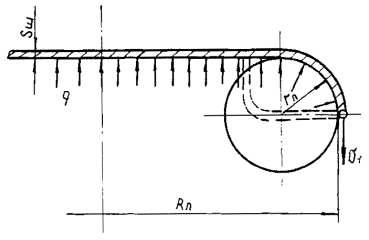 q1, q2, q(1), q(2) - давления первого, второго теплоносителей и давление в концевых камерах, примыкающих к плитам; n1, n2 - число камер с первым и вторым теплоносителем. Часть контура средней линии концевой прокладки разборного теплообменного аппарата Черт. 38 Контур средней линии прокладки пластины полуразборного теплообменного аппарата Черт. 39 Пластина неразборного теплообменного аппарата Черт. 40 Таблица 3 7. КОЛЛЕКТОРЫ7.1. Коллекторы под действием внутреннего давления 7.1.1. Расчетные схемы представлены на черт. 41, 42. 7.1.2. Расчетные формулы применимы при условии r/S17³5. 7.1.3. Цилиндрическая панель с боковыми стенками 7.1.3.1. Расчетная нагрузка от давления среды, приходящаяся на панель и боковые стенки