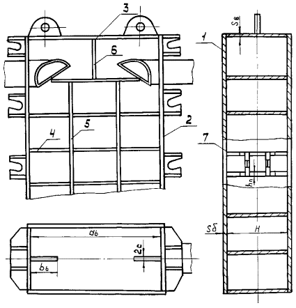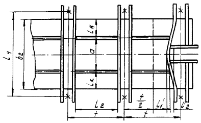 При наличии анкерных связей коэффициент t определяется расчетным или экспериментальным путем. При отсутствии данных расчетов и экспериментов принимается t=1. Промежуточная плита 1 - боковая стенка 2 - торцевая стенка (боковое продольное ребро); 3 - верхний лист; 4 - поперечное ребро 5 - продольное промежуточное ребро 6 - среднее продольное ребро крайней панели 7 - опорный угол Черт. 20 Схема возможного расположения прокладок