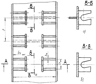 4.5. Толщина торцевой стенки hm 4.5.1. Если кронштейны связаны планками (черт. 20), то расчет ведется по п. 4.4. 4.5.2. Если кронштейны не связаны планками и ребра не приварены к торцевой стенке в зоне расположения кронштейна (см. черт. 22б).