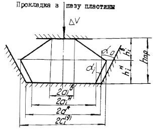 Деформированное сварное соединение Черт. 58 Схема пластины с ограничителем Черт. 59 ПРИЛОЖЕНИЕ 1Рекомендуемое ПРОГРАММА РАСЧЕТА ПРОКЛАДКИ НА "НАИРИ-2"i=3, а, н, р, м, о, у 1 Введем а1, а2, с, н1,н2, е, в, ш, z, уо, у1, у2, у3 2 Вычислим о1= а1, о2= а2, u=c, р1=м1, р2=м2, s=е, g=0, r=0. 3 Допустим n=0 4 Вычислим d=8zc1s/(3(p1+p2)), м2=2dр2(8so1), м1=3dр1(8so1) 5 Вычислим o0=a0o2/o1, м=((o1+u)p1+(o2+u)p2-(o1+a0+u)(p1-м1)-(c2+c0+u)(p2-м2))/(p1+p2-м1-м2) 6 Вычислим o=o1+a0, o2=o2+o0, u=uTн0, р1=р1-м1, р2=р2-м2, m=в+р2ш 7 Вычислим r=r+z, q=q+d, 8 если L-Ус£0 идти к 11 9 Вычислим t=LnL, s=exp(y1(Ln5+6Ln10)+(1-y1)t-Ln(y1y2) 10 идти к 12 11 допустим s=e 12 Вставим n=n+1 13 если n-10<0 идти к 17 14 печатаем с 4 Знаками г 15 печатаем c 4 Знаками q 16 идти к 18 17 если u-m<0 идти к 4 18 если u-m< 0 идти к 3 19 Вычислим t=o2 20 если t-в³0 идти к 25 21 если n-10<0 идти к 23 22 допустим n=0 23 Вычислим н0=0, d=8zo1s/(3(p1+p2)), a0=3d/(8s), м1=3dр1(8so1), м2=3dр2(8so1), o0=((o1+m)p1+(o2+m)m2-(o1+a0+m)(p1-м1))/(p2-м2) 24 идти к 6 25 допустим o=0 26 Вычислим н0=0, o0=0, d=8zo1s/(3(p1), м1=3dр1(8so1), м2=0, а0=(o1+m)м1/(p1-м1) 27 Вычислим o1=o1+a0, p1=p1-м1, q=q+d, 28 Вычислим r=r+z 29 Вставим n=n+1 30 если L-Уo£0 идти к 33 31 Вычислим t=LnL, s=exp(y1(Ln5+6Ln10)+(1-y1)t-Ln(y1y2) 32 идти к 34 33 допустим s=e 34 Вычислим t=y3+10z 35 если n-1-<0 идти к 38 36 печатаем с 4 Знаками q r 37 идти к 39 38 если r-t£0 идти к 26. 39 если r-t£0 идти к 25 40 идти к 1 исполним 1 ПРИЛОЖЕНИЕ 2Справочное ТЕРМИНЫ И ИХ ОБОЗНАЧЕНИЯ