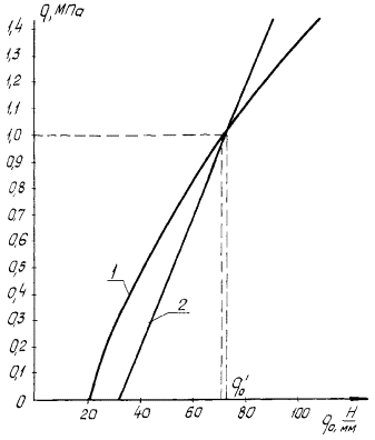 при условии 9.3. Расчет прокладок позволяет определить усилие на прокладке при затяжке стяжных болтов. 9.4. Усилие на прокладке определяется по характеристике прокладки (черт. 48) в зависимости от заданной осадки, величина которой определяется конструкцией герметизирующего узла (черт. 46). 9.5. Характеристика прокладки определяется экспериментально. Экспериментальные данные приведены в табл. 5. При отсутствии экспериментальных данных характеристика прокладки строится приближенно расчетным путем. Черт. 46 Черт. 47 Характеристика прокладки ТПР-0,6 из резины марки 4326 Черт. 48 Таблица 5 Экспериментальные характеристики прокладок