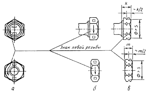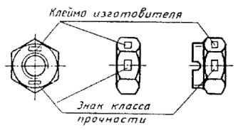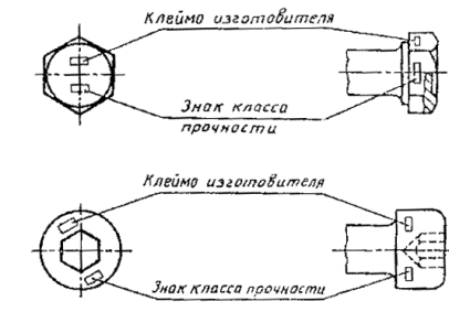 2.4. Маркировка 2.4.1. Общие правила маркировки 2.4.1.1. Болты с шестигранной головкой, винты с цилиндрической головкой и шестигранным углублением под ключ, шпильки и гайки шестигранные следует маркировать знаком класса прочности (или группы материала) и клеймом (товарным знаком завода-изготовителя, а изделия с левой резьбой дополнительно знаком левой резьбы. Обязательной маркировке подлежат: болты с шестигранной головкой классов прочности 4.6, 5.6, 6.6, 8.8, 9.8, 10.9, 12.9; винты с цилиндрической головкой и шестигранным углублением под ключ и шпильки классов прочности 8.8, 9.8, 10.9, 12.9; гайки классов прочности 05, 8, 9, 10, 12. (Измененная редакция. Изм. № 1). 2.4.1.2. Изделия, не указанные в п. 2.4.1.1 и неуказанных классов прочности, а также изделия, изготовленные методом резания, маркируют по соглашению между изготовителем и потребителем. 2.4.1.3. Знаки маркировки могут быть выпуклыми или углубленными. 2.4.1.4. При маркировке классов прочности допускается не ставить точку, разделяющую первое и второе число знака класса прочности. При использовании для изделий класса прочности 10.9 низкоуглеродистых мартенситных сталей знак класса прочности должен быть подчеркнут: 10.9 или 109. (Измененная редакция. Изм. № 1). 2.4.1.5. Размеры знаков маркировки устанавливает завод-изготовитель. 2.4.2. Маркировка болтов с шестигранной головкой и винтов с цилиндрической головкой и шестигранным углублением под ключ 2.4.2.1. Маркировке подлежат болты и винты с диаметром резьбы d³6 мм. 2.4.2.2. Знаки маркировки наносят на торцевой или боковой поверхности головки болта или винта (черт. 1). Знаки на боковой поверхности головки должны быть углубленными. Черт. 1 2.4.2.3. При маркировке выпуклыми знаками допускается увеличение наибольшей предельной высоты головки болта или винта на: 0,1 мм - для изделий с диаметром резьбы d£8 мм; 0,2 мм- » » » » 8 мм<d£12 мм; 0,3 мм- » » » » d>12 мм. 2.4.3. Mapкировка шпилек 2.4.3.1. Маркировке подлежат шпильки с диаметром резьбы d³12 мм. Допускается маркировать шпильки с диаметром резьбы d³8 мм с применением заменительных знаков: ○ - Для класса прочности 8.8; + - » » » 9.8; □ - » » » 10,9; ∆ - » » » 12.9. 2.4.3.2. Знаки маркировки наносят на торце гаечного конца шпильки. 2.4.4. Маркировка шестигранных гаек 2.4.4.1. Маркировке подлежат гайки с диаметром резьбы d³5 мм. 2.4.4.2. Знаки маркировки наносят на одной из торцевых поверхностей. В технически обоснованных случаях допускается наносить знаки маркировки на боковых поверхностях гаек (черт. 2). Знаки должны быть углубленными. Черт. 2 2.4.4.3. Допускается применение циферблатной маркировки гаек (черт. 3). В этом случае маркировка наносится на фасках выпуклыми или углубленными знаками или на торцевой поверхности углубленными знаками. 2.4.5. Маркировка болтов, шпилек и гаек с левой резьбой 2.4.5.1. Знаком левой резьбы является стрелка, указывающая направление ввинчивания болта, шпильки и навинчивания гайки. Черт. 3 2.4.5.2. Знак левой резьбы наносят на торцевой поверхности головки болта, на одной из торцевых поверхностей гайки (черт. 4а), на конце гаечного конца шпильки. В технически обоснованных случаях допускается наносить знак левой резьбы на боковых поверхностях гайки и головках болтов (черт. 4б). В этом случае знаки должны быть углубленными. 2.4.5.3. Знак левой резьбы для болтов и гаек может заменяться надрезами на ребрах шестигранников (черт. 4в). Черт. 4 3. ПРИЕМКА3.1. Правила приемки болтов, винтов, шпилек и 