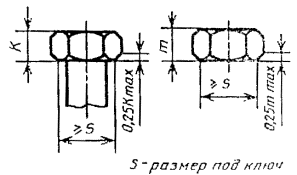 2. Притупление ребер шестигранника или квадрата к опорной поверхности или торцу головки болта и к опорной поверхности гайки не более 0,25 высоты головки болта или гайки (черт. 6).