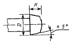 6. Уклон образующей головки не более 5° и сфера на верхнем торце головки, не должны выводить высоту цилиндрической головки за наибольший предельный размер (черт. 7).