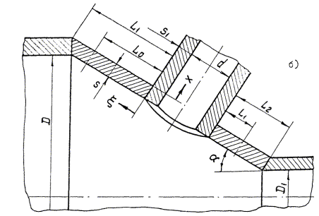 4. НАПРЯЖЕНИЯ В МЕСТЕ ПЕРЕСЕЧЕНИЯ ПАТРУБКА С КОНИЧЕСКИМ ПЕРЕХОДОМ (КОНИЧЕСКИМ ДНИЩЕМ)4.1. Область применения расчетных формул (черт. 1б)