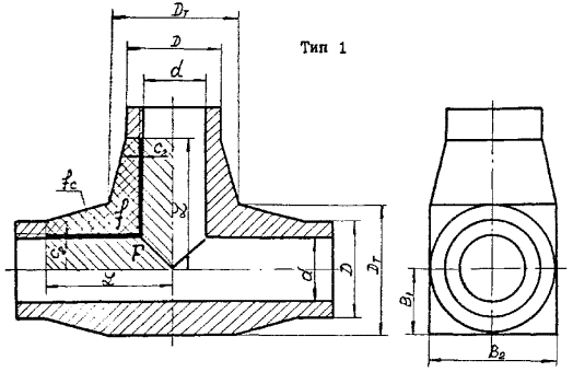 4.5. В случае технической целесообразности размеры B1 и B2 для тройников типа 1 (черт. 9, 10) допускается принимать равными: для равнопроходных деталей - B1=0,45DT; B2=0,9DT; для переходных деталей - B1=0,45DT1; B2=0,9DT1. В любом случае должны выполняться условия: для равнопроходных деталей - для переходных деталей - 4.6. Проверочный расчет4.6.1. В случае необходимости проводится проверочный расчет детали. Необходимое условие прочности: