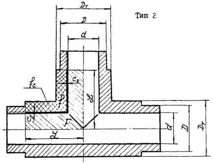 но не менее S. (Измененная редакция, Изм. №1). 3.3.3. Коэффициенты у1 и у2 определяются по черт. 8. Черт. 7 Черт. 8 4. КОВАНЫЕ ДЕТАЛИ4.1. Приведенные в разделе формулы применимы для расчета кованых тройников и угольников конструкций, показанных на черт. 9 - 12. 4.2. Условные обозначенияd - номинальный внутренний диаметр равнопроходной детали, мм; d1, d2 - соответственно номинальные внутренние диаметры основной трубы и отвода переходной детали, мм; fc - площадь, подвергаемая коррозионно-эрозионному износу, мм2. (Измененная редакция, Изм. №1). Обозначения остальных размеров деталей и расчетные площади и показаны на черт. 9 - 12. Остальные обозначения - согласно подразделу 1.1. 4.3. Расчет равнопроходных деталей4.3.1. Наружный диаметр D цилиндрической части детали определяется в соответствии с разделом 2. 4.3.2. Диаметр укрепленного участка DT определяется по формуле