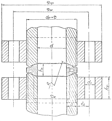 (Измененная редакция, Изм. №1). 7.4.4. Номинальный диаметр резьбы шпильки dш назначается конструктивно по диаметру стержня шпильки. Рекомендуется ряд: М10, 12, 14, 16, 20, 22, 24, 27, 30, 33, 36, 39, 42, 45, 48, 52, 56, 60, 64, 68, 72, 76, 80, 90, 100 мм. 7.5. Расчет фланцев7.5.1. Размеры фланца принимаются конструктивно из условия размещения шпилек: Рекомендуется принимать: Наружный диаметр фланца Dф