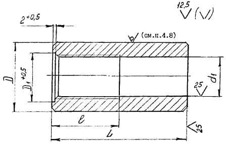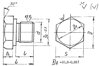 Пример условного обозначения прокладки с внутренним диаметром 13 мм, наружным диаметром 30 мм из паронита марки ПОН: Прокладка 13´30-ПОН АТК 24.218.01-90. 4 Общие технические требования4.1 Бобышки, пробки и прокладки должны изготавливаться в соответствии с требованиями настоящего альбома типовых конструкций по чертежам, утвержденным в установленном порядке. 4.2 Материал пробок и бобышек должен соответствовать указанным в таблице 13. Материал пробок и бобышек выбирается в каждом, отдельном случае в зависимости от условий эксплуатации и должен соответствовать материалу аппаратов, для которых они предназначены. Допускается изготовление бобышек и пробок из других марок сталей по нормативно-технической документации. Пределы применения по температуре и давлению должны соответствовать ОСТ 26-291. 4.3 Материал прокладок: - алюминий марки АД1М ГОСТ 21631; - паронит марок ПОН, ПМБ, ПМБ-1 ГОСТ 481; - латунь марки Л63 (мягкая) ГОСТ 2208; - медь марки M1 ГОСТ 1173; - сталь марки 08Х18Н10 (мягкая) ГОСТ 4986; - сталь марки 08Х18Н10Т ГОСТ 5632; - картон прокладочный ГОСТ 9347; - резина ГОСТ 7338; - фторопласт-4 ГОСТ 10007. 4.4 Резьба метрическая - по ГОСТ 24705, поле допусков для бобышек - 6Н, для пробок - 6q ГОСТ 16093. Резьба трубная цилиндрическая - по ГОСТ 6357, трубная коническая - по ГОСТ 6211. Размеры сбегов, недорезов, проточек и фасок - по ГОСТ 10549. 4.5 При нарезании резьбы проточку допускается не делать. 4.6 Резьба должна иметь полный, чистый и гладкий профиль. На резьбе не должно быть надорванных или смятых витков, препятствующих навинчиванию проходного калибра. 4.7 Размер d1 принят по ГОСТ 19257, ГОСТ 21348 и ГОСТ 21350. 4.8 Шероховатость наружной поверхности (рисунок 1) допускается выполнять Ra=25 мкм. 4.9 Неуказанные предельные отклонения размеров - по рабочей документации предприятия-изготовителя. 4.10 Масса бобышек и пробок подсчитана из условия плотности материала 2,85 г/см3, прокладок - 2,0 г/см3. 4.11 Пробное гидравлическое испытание бобышек производится, как правило, совместно с аппаратом и блоком в соответствии с ОСТ 26-291. 4.12 Маркировать: условное обозначение без наименования детали и материал. Для деталей, не имеющих самостоятельной поставки, маркировку производить в порядке, принятом на предприятии-изготовителе. Таблица 13