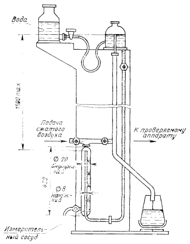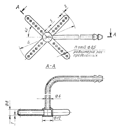 где V - объем влажного газа, м3; t - температура газа непосредственно на выходе из счетчика, °С; рб - барометрическое давление воздуха в лаборатории, Па, (мм рт. ст.); рг - избыточное давление газа непосредственно на выходе из счетчика, Па (мм рт. ст.); рпар - парциальное давление насыщенного водяного пара в газе на выходе из счетчика, Па (мм рт. ст.). Парциальное давление насыщенного водяного пара в газе следует принимать по таблице, приведенной в приложении. Аппарат должен проработать перед замером не менее 5 мин. (Измененная редакция, Изм. № 2). 4.3.3. Тепловую мощность запальной горелки (п. 1.3) необходимо определять по аналогии с п. 4.3.2 при неработающей основной горелке. (Измененная редакция, Изм. № 1). Черт. 3 Примечание. Диаметр d - на 8 ± 2 мм меньше внутреннего диаметра патрубка аппарата. Число отверстий на каждой из четырех трубок при тепловой нагрузке до 9000 Вт равно 4; свыше 9000 Вт равно 6. 4.3.4. Определение содержания окиси углерода в продуктах сгорания (п. 1.6) - по СТ СЭВ 4221-83. Продукты сгорания следует отбирать пробоотборником, схема которого приведена на черт. 3. (Измененная редакция, Изм. № 2). 4.3.5. Температура воды на выходе из аппарата (п. 1.7) должна быть проверена при номинальной тепловой мощности. Расход воды, протекающей через аппарат, необходимо снижать до прекращения работы основной горелки или уменьшения величины ее пламени. Проверку следует проводить 5 раз в положениях, зафиксированных на рукоятке терморегулятора. За окончательный результат следует принимать среднее арифметическое пяти измерений. 4.3.6. Температуру продуктов сгорания на выходе из аппарата (п. 1.8) следует определять на расстоянии 300 мм от тягопрерывателя при номинальном давлении газа, указанном в табл. 4. 4.3.7. Проверку аппарата на соответствие требованиям пп. 2.2 - 2.6; 2.12а; 2.13; 2.22 следует проводить визуально. 4.3.5 - 4.3.7. (Измененная редакция, Изм. № 1). 4.3.8. Проверку автоматики безопасности п. 2.7 необходимо проводить после того, как горелочное устройство проработает не менее 5 мин. Время подачи газа к основной горелке следует определять от момента зажигания запальной горелки до момента воспламенения газа на основной горелке или срабатывания электромагнитного клапана. Время прекращения подачи газа к аппарату при погасании пламени запальной горелки следует определять прекращением подачи газа на основную и запальную горелки. Не более чем через 60 с следует возобновить подачу, при этом поступление газа к основной и запальной горелкам не допускается. При приемо-сдаточных испытаниях допускается проводить проверку посредством контроля времени срабатывания электромагнитного клапана после прекращения подачи газа на горелочное устройство. Прекращение подачи газа к аппарату при отсутствии тяги в дымоходе следует проверять перекрытием дымохода. Через 60 с после перекрытия дымохода пламя горелочного устройства должно погаснуть. При перекрытии дымохода на 10 с пламя горелочного устройства не должно гаснуть. Испытание следует проводить не менее 5 раз. При приемо-сдаточных испытаниях допускается проводить проверку один раз. 4.3.9. Работоспособность аппарата при изменении разрежения в дымоходе от 1,96 до 29,4 Па (от 0,2 до 3 мм вод. ст.) (п. 2.8) следует проверять на номинальном давлении газа. Разрежение следует измерять на расстоянии 300 мм от тягопрерывателя. Отрыв пламени и ухудшение горения не допускают