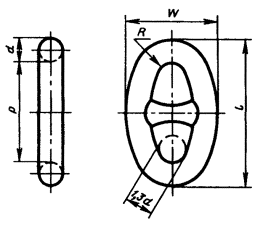 d - калибр цепи; d3 - калибр соединительного звена; d3 = d; l3 = 6 d; р3 = 4 d; w3 » 4,2 d; К » 1,52 d; R2 » 0,67 d; R3 » 1,83 d Черт. 4 Таблица 4 Размеры, мм
