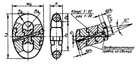 * Размеры увеличенных звеньев. Примечание. Увеличенным звеном для цепи данного калибра является общее звено большего калибра, причем размеры увеличенного звена должны составлять » 1,1 размеров общего звена. Концевое звено