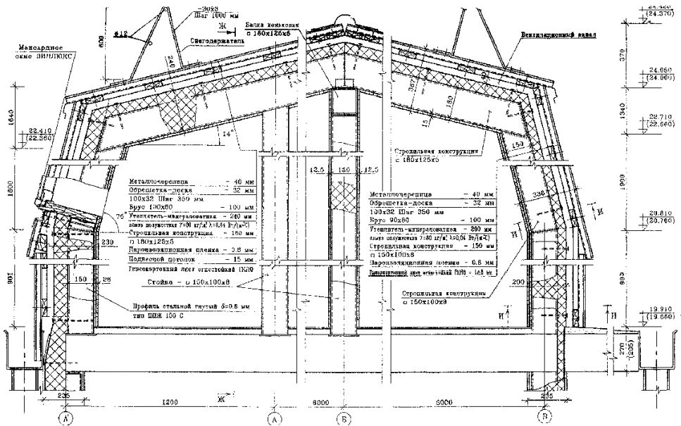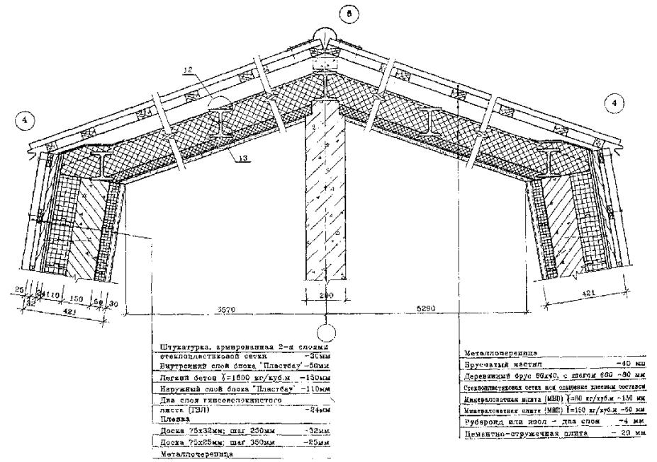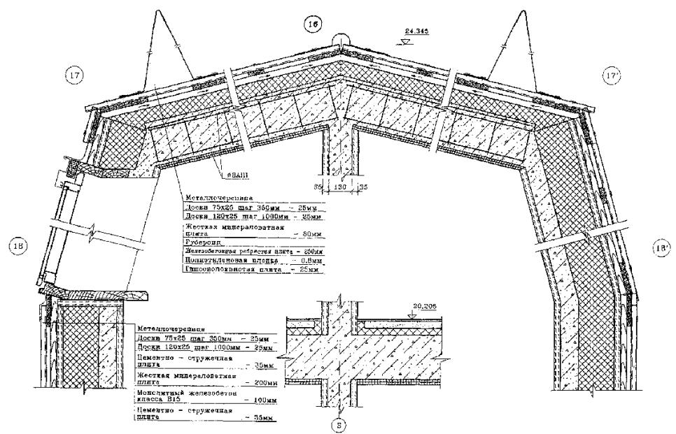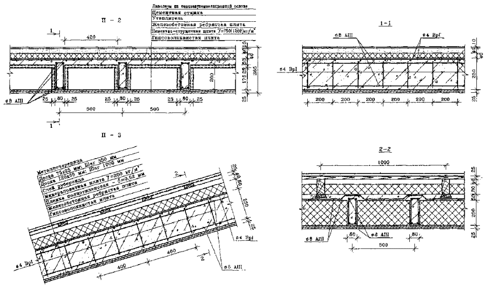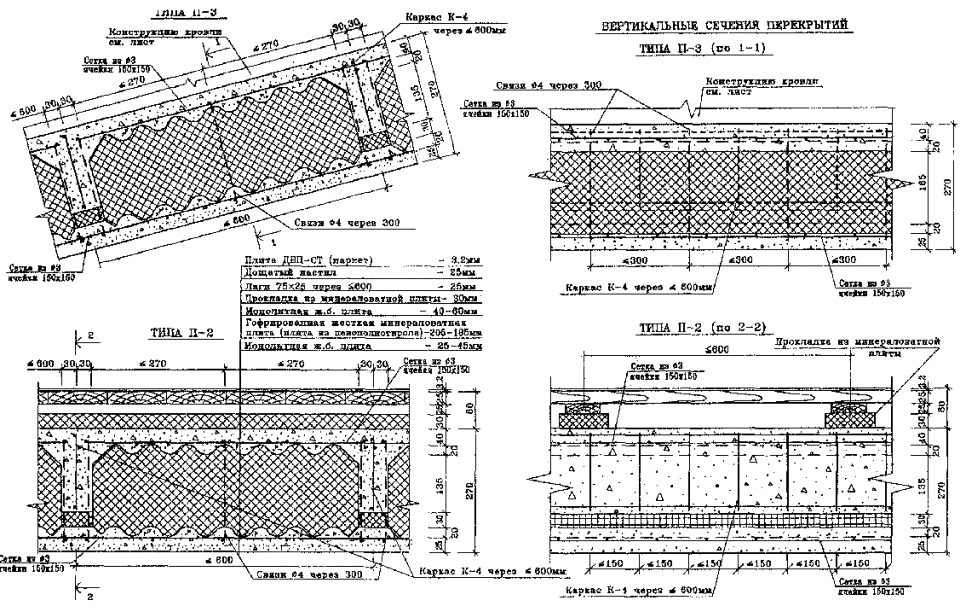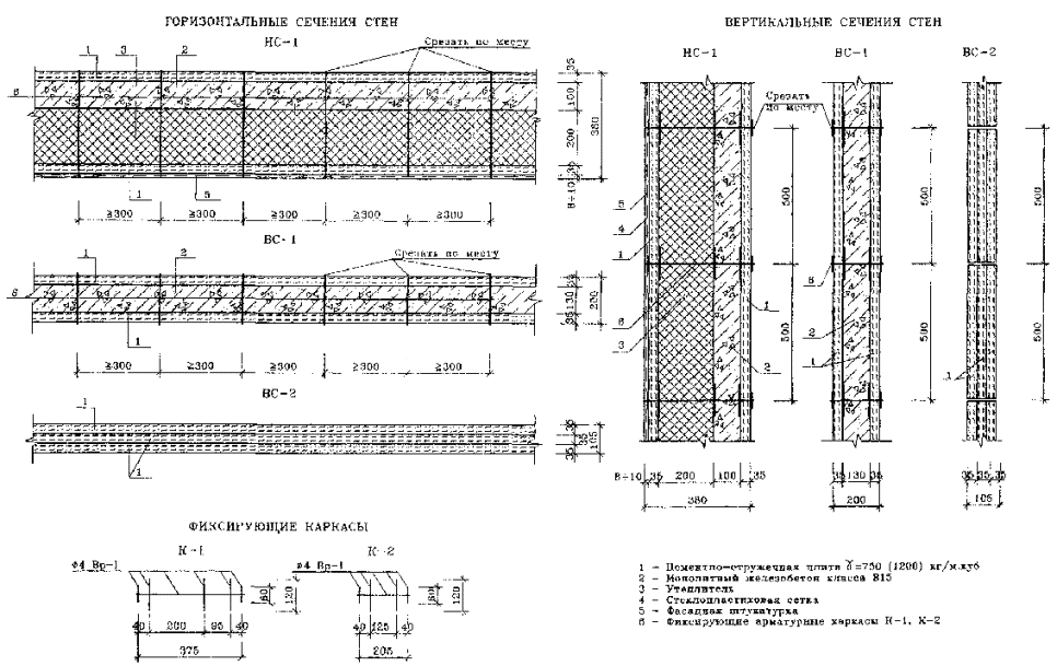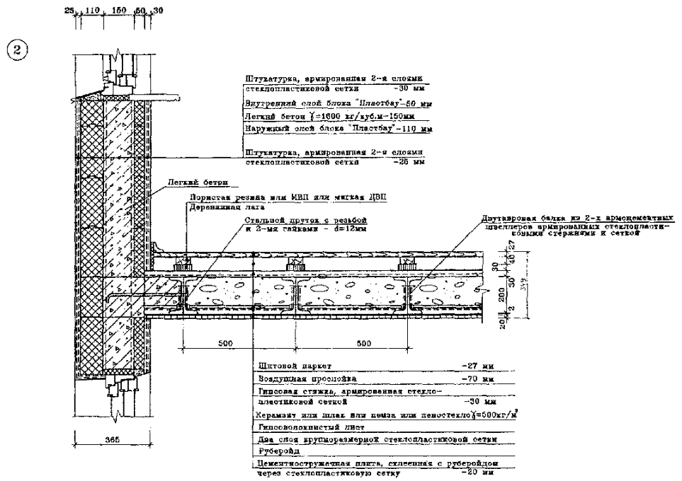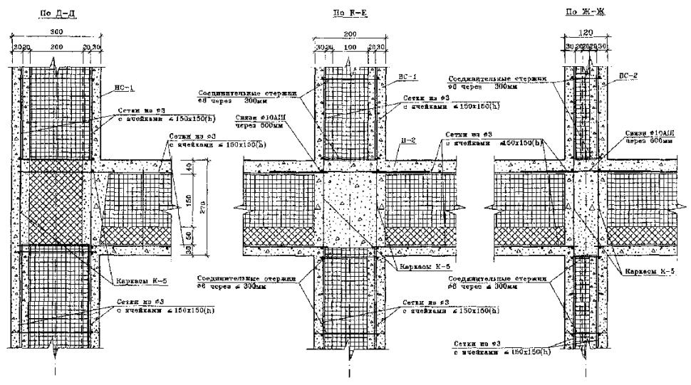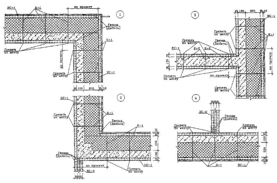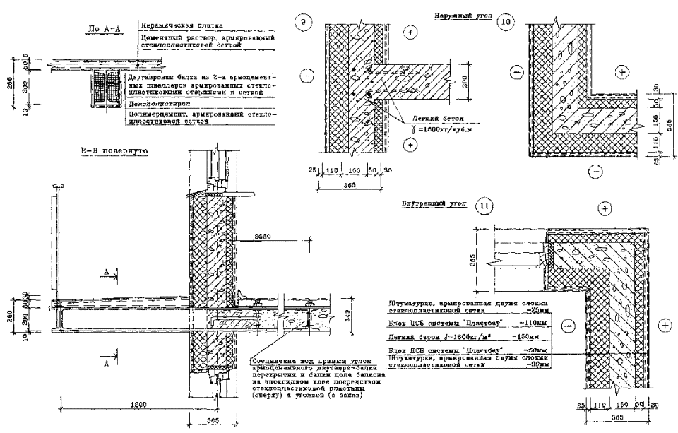 Рис. 3. Схемы устройства плит перекрытий и покрытий в системе с оставляемой опалубкой из ЦСП Рис. 4. Устройство скатной крыши в системе с оставляемой опалубкой из ЦСП 2.2.2. Крыша (рис. 5) В качестве несущей основы могут быть использованы армоцементные двутавровые балки № 20, укладываемые вдоль дома на поперечно-несущие внутренние каркасные стены. Балки могут быть армированы стеклопластиковыми стержнями и сетками. Их составляют из двух предварительно изготовленных швеллеров № 20, сболчиваемых между собой болтами из стеклопластика (или пластмассовыми дюбелями). По низу балок устанавливают подвесной потолок из цементно-стружечной плиты, склеенной с рубероидом в 2 слоя через стеклопластиковую сетку. На рубероид рекомендуется укладывать деревянные бруски 50´40 через 600 мм, между которыми на клею устанавливают минераловатную плиту γ = 150 кг/м3. Подвесной потолок через деревянные бруски крепится к двутаврам посредством мастики и металлических пластин, загибаемых на полки двутавра. Между двутавровыми балками укладывают полужесткую минераловатную плиту до верха двутавра балки. Балки и МВП целесообразно укрывать слоем стеклопластиковой сетки или распыленного клея. Сверху, вдоль ската крыши, рекомендуется укладывать деревянный брус 80´40 мм с прорезями (с шагом - 600 мм) под полки двутавра. Брус пристреливают дюбелями к швеллерам или крепят проволочной скруткой, затем настилают обрешетку и кровлю из металлочерепицы или ондулина. 2.2.3. Перекрытие междуэтажное (рис. 6) Несущей его основой служат такие же, что и для крыши двутавровые армоцементные балки. К ним снизу рекомендуется пристреливать дюбелями цементно-стружечные плиты (ЦСП), склеенные с рубероидом через стеклопластиковую сетку. Двутавры следует устанавливать через 500 мм. Между двутаврами укладывают два слоя стеклопластиковой сетки и лист ГВЛ. В пространство между балками рекомендуется насыпать керамзит, шлак, пемзу или пеностекло. Затем укладывают слой самовыравнивающейся гипсовой стяжки с армированием стеклопластиковой сеткой. По центрам двутавров крепят на мастике полосы пенорезины или мягкой ДВП. По ним можно укладывать деревянные лаги, а сверх них щитовой паркет. 2.2.4. Внутренние стены (рис. 7) Продольную стену рекомендуется выполнять из легкого бетона толщиной 20 см, поперечные - каркасными из двутавровых армоцементных ригелей и стоек с заполнением минераловатными плитами и обшивками из ЦСП. Рис. 5. Устройство скатной крыши в системе с оставляемой опалубкой из пенополистирола Рис. 6. Устройство наружных стен и перекрытий в системе с оставляемой опалубкой из пенополистирола Рис. 7. Узлы соединения наружных стен в углах, с внутренними стенами и с балконными плитами в системе с оставляемой опалубкой из пенополистирола 2.3. Система монолитных оболочек из торкретбетона по оставляемой опалубке2.3.1. За основу предлагаемых вариантов технических решений облегченных конструкций стен и перекрытий в виде монолитных оболочек из торкретбетона по оставляемой опалубке для 3-этажной надстройки 5-этажных домов приняты строительные системы "НИДЬОН" (Италия) и "СПИД ВОЛ" (Англия). В этих системах в качестве оставляемой опалубки при бетонировании в построечных условиях используют изготавливаемые на заводе или полигоне унифицированные крупноразмерные блоки из панелей ("НИДЬОН") или брусков ("СП