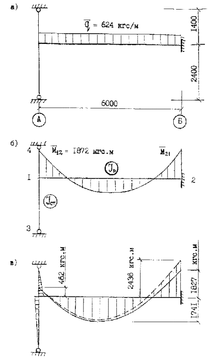 Рис. 18. Расчетная схема для определения усилий в раме а - схема опирания и нагрузка; б - обозначение узлов и жесткостей, эпюра неуравновешенных моментов по [41] в - эпюра моментов: - - - в упругой стадии, ______ с учетом пластических деформаций. Подбор продольной арматуры по прочности С учетом перераспределения усилий с опоры "Б" в пролет [40] на 25 % момент над средней опорой (стеной) Мб = 0,75´2436 = 1827 кгс . м.