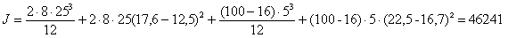 нормативной нагрузки Реакция на левой опоре Ran = 510(5,9/2) - (1991 - 378):5,9 = 1232 кгс; моменты в пролете (кгс . м): М1/6n = 1232´0,99 - 510´0,99 2/2 - 378 = 592; М1/3n = 1232´1,97 - 510´1,972/2 -378 = 1059; М1/2n = 1232´2,95 - 510´2,952/2 - 378 = 1039; М2/3n = 1232´3,94 - 510´3,942/2 - 378 = 519; М5/6n = 1232´4,92 - 510´4,922/2 - 378 = - 483 кгс . м. Для условной полосы шириной 1 м, пренебрегая в запас арматурой, площадь бетонного сечения А = 100´5 + 2´8(25 - 5) = 820 см2; статический момент относительно нижней грани S = 2´8´25´12,5 + (100 - 16)´5´22,5 = 14450 см3; ордината центра тяжести уц = 14450/820 = 17,6 см; момент инерции