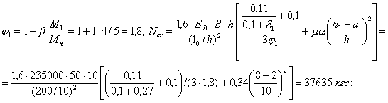 По формулам п.п. 3.30 ¸ 3.32 "Пособия" [39]: условие (47) Q < 0,3 φW1 . φB1 . RBBh0: при φw1 = 1 + 5 α μ = 5´7,23´0,0016 = 1,056; φВ1 = 1 - 0,01 RВ = 1 - 0,01´7,85 = 0,92; правая часть условия (47): 0,3´1,056´0,92´78,5´16´23 = 10005 кгс; Q = 1910 < 10005 кгс; условие (47) удовлетворено. В условиях (51) ¸ (53) МВ = φв2 . RВt . в . h02 = 2´6,83´16´232 = 115618 кгс . см;