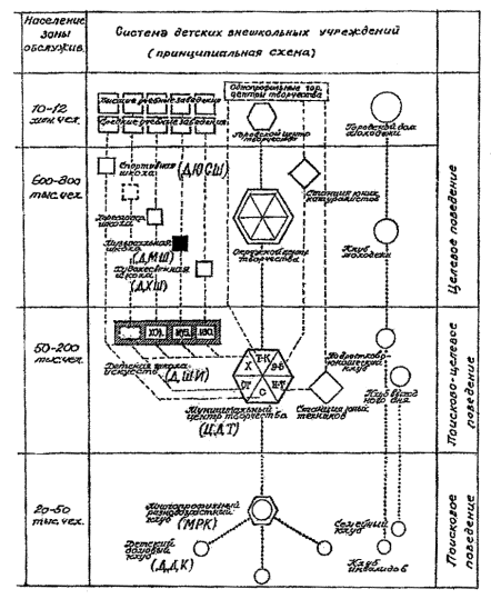 1При доле школьников в населении, равной 11% 5.8.1. В новых, а также в сложившихся районах (муниципальных округах) при отсутствии ДШИ и других подобных формирований (кружков, студий и т.п.) распределение учащихся между отделениями ДШИ и другими аналогичными объектами предлагается проводить согласно табл. 1. 5.1.9. Для укрупненных градостроительных расчетов сетей ДМЕШ и ДШИ (в т.ч. при разработке проектов детальной планировки и застройки крупных селитебных образований) предлагается использовать суммарный показатель потребности в ДМШ и ДШИ, составляющий 8,2 учащихся на 1000 жителей соответственно (что обеспечит суммарный охват этими учреждениями школьников в размере 7,5% их общего числа). 5.2. ТЕРРИТОРИАЛЬНАЯ ОРГАНИЗАЦИЯ СЕТИ И ПРИНЦИПЫ РАЗМЕЩЕНИЯ УЧРЕЖДЕНИЙ5.2.1. Территориальная организация сетей ДМШ и ДШИ определяется предельными радиусами доступности, зависящими от степени подвижности обслуживаемых контингентов, а также от массовости или уникальности объекта. 5.2.2. Радиус обслуживания ДШИ как массового учреждения эстетического воспитания и образования, рассчитанного на широкий охват школьников (до 50% общего потока детей 7-17 лет, ориентированных на занятия в сфере искусства), определяется в пределах 15 минут транспортно-пешеходной доступности, т.е. 1-1,5 км. 5.2.3. Площадь зоны обслуживания ДШИ - от 300 до 700 га, численность проживающего населения (в зависимости от конфигурации территории и плотности жилого фонда) от 60 до 200 тыс. чел. 5.2.4. Соответствие градостроительных характеристик зоны обслуживания ДШИ параметрам одного или нескольких муниципальных округов Москвы позволяет отнести ДШИ к учреждениям муниципального ранга, районного уровня обслуживания. 5.2.5. ДШИ рекомендуется размещать, по возможности, в центре обслуживаемой территории - в составе общественного центра муниципального округа или группы округов так, чтобы зоны обслуживания ДШИ равномерно покрывали все жилые территории административного округа. 5.2.6. При размещении ДШИ необходимо предусмотреть удобные пешеходные связи с жилой застройкой и группой общеобразовательных школ, расположенных в зоне влияния ДШИ, а также - с остановками общественного транспорта и зелеными зонами. 5.2.7. ДМШ как более узко специализированное учреждение, обеспечивающее в сфере музыкального искусства обучение музыкально одаренных детей, ориентировано преимущественно на транспортную доступность в пределах 20 минут, что соответствует радиусу до 3 км. 5.2.8. Площадь зоны обслуживания ДМШ - около 2800 га, численность проживающего населения (в зависимости от конфигурации территории и плотности застройки) от 250 до 800 тыс. человек. 5.2.9. Ввиду узкой специализации ДМШ не являются учреждениями массового типа подобно ДШИ. Близость показателей численности населения зон обслуживания к числу жителей административных округов позволяет отнести эти учреждения к локально-городскому уровню обслуживания и рангу административного округа. 5.2.10. На территории административного округа в зависимости от его величины могут размещаться одна или несколько ДМШ. Их следует включать в состав учреждений локально-городского или местного общественных центров, располагая в непосредственной близости к транспортному узлу городского или регионального значения. 5.2.11. В сложной градостроительной ситуации ДМШ могут образовывать систему т