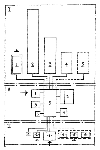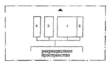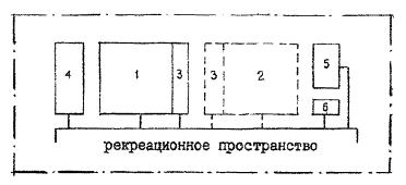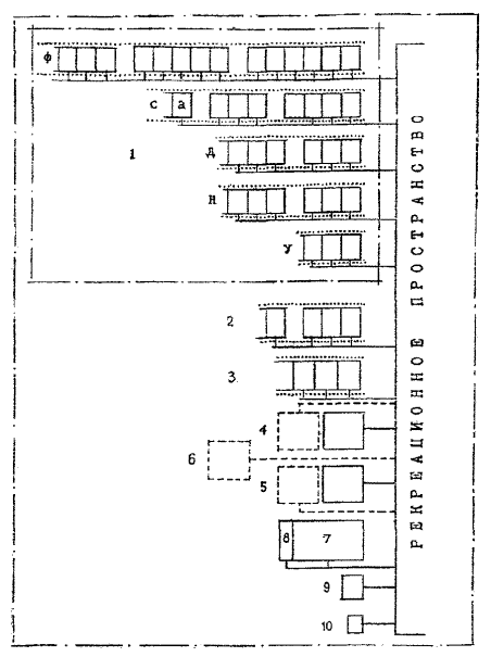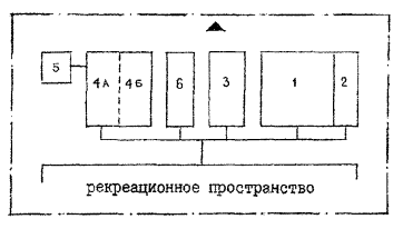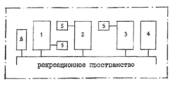 1При числе посещений в неделю - 4, смен в день - 2, рабочих дней в неделю - 6» 5.4.9. Вместимость подготовительного отделения, в случае его включения в структуру ДМШ, следует принимать в пределах 5-15% общей вместимости учреждения по специальностям. 5.4.10. Вместимость и структуру зданий ДМШ и ДШИ следует принимать по заданиям на проектирование, составленным с учетом настоящих рекомендаций. 6. АРХИТЕКТУРНО-ПЛАНИРОВОЧНЫЕ РЕШЕНИЯ ЗДАНИЙ ДШИ И ДМШ6.1. ОБЩИЕ ТРЕБОВАНИЯ6.1.1. Здания ДШИ и ДМШ следует проектировать не более трех-четырех этажей. 6.1.2. При проектировании зданий ДШИ и ДМШ следует предусматривать объединение отдельных помещений в функционально-планировочные элементы, исходя из требований технологии учебно-педагогического процесса, освещения помещений, акустических, звукоизоляционных, санитарных и противопожарных требований. 6.1.3. Требования к освещению помещений ДМШ и ДШИ приведены в "Рекомендациях по проектированию зданий детских школ искусств"; акустические и звукоизоляционные требования - в Приложении 3 настоящих Рекомендаций. 6.1.4. Высоты помещений следует принимать в соответствии со СНиП 2.08.02.-89*, кроме помещений классов хора, оркестра, хореографического зала и зала для занятий по ритмике, высоту которых рекомендуется принимать равной 3,9 м. 6.1.5. Ширина дверей и тамбуров в помещениях для музыкальных занятий должна быть менее 1,8 м для беспрепятственной транспортировки громоздких музыкальных инструментов (рояль, пианино). 6.1.6. Для вертикальной транспортировки громоздких музыкальных инструментов рекомендуется предусмотреть грузовой лифт 6.1.7. Проектирование зданий ДШИ и ДМШ должно осуществляться с учетом потребностей детей-инвалидов в соответствии с "Руководством по учету потребностей инвалидов при градостроительном и объемном проектировании для г. Москвы и ЛПЗП". 6.2. ФУНКЦИОНАЛЬНАЯ СТРУКТУРА ЗДАНИЙ6.2.1. Функциональная структура зданий ДШИ и ДМШ включает три группы помещений: учебную, общешкольную и административно-хозяйственную. Общие функциональные схемы ДШИ и ДМШ приведены на рис. 2 и 3. 6.2.2. Учебная группа помещений в ДШИ подразделяется на четыре основные функциональные зоны: подготовительное отделение, музыкальное отделение, хореографическое отделение и отделение изобразительного искусства. Кроме того, в состав учебной группы в зависимости от особенностей программы конкретной школы могут входить отделения, ориентированные на другие виды искусства, в т.ч. театральное. Учебная группа в ДМШ включает подготовительное отделение и группу помещений основной программы обучения. 6.2.3. В состав общешкольных помещений входят: входная группа помещений, концертный зал с сопутствующими помещениями, библиотека, рекреационные помещения и санитарно-гигиенические помещения. В ДШИ рекомендуется размещение репетиционного зада и совмещение фойе с выставочным залом, а в ДМШ - размещение малого концертного зала. 6.2.4. Административно-хозяйственная группа помещений включает: кабинеты для административно-хозяйственного персонала, буфет и санитарно-гигиенические помещения, мастерские по ремонту музыкальных инструментов, мастерские по ремонту хозяйственного инвентаря, склады и кладовые. 6.3. ФУНКЦИОНАЛЬНЫЕ ГРУППЫ ПОМЕЩЕНИЙ И АРХИТЕКТУРНО-ПЛАНИРОВОЧНЫЕ ЭЛЕМЕНТЫ ЗДАНИЙ6.3.1. Функционально-планировочные схемы подготовительных отделений Д