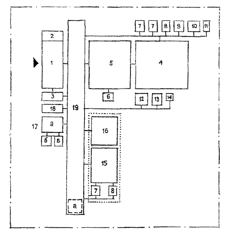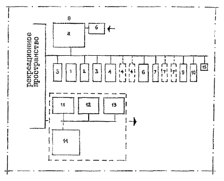 Примечание. Площадь учебных помещений, не приведенных в табл.9, устанавливается заданием на проектирование. РИС. 10 ФУНКЦИОНАЛЬНО-ПЛАНИРОВОЧНАЯ СХЕМА АДМИНИСТРАТИВНО-ХОЗЯЙСТВЕННОЙ ГРУППЫ ПОМЕЩЕНИЙ ДШИ И ДМШ 1 - кабинет директора, 2 - комната секретаря, 3 - кабинет завуча, 4 - учительская комната для преподавателей, 5 - канцелярия, 6 - бухгалтерия, 7 - комнаты технического персонала, 8 - буфет (а - зал с раздаточной, 6 - подсобное помещение с моечной), 9 - медкабинет, 10 - кладовые уборочного инвентаря, 11 - мастерские по ремонту музыкальных инструментов, 12 - столярная мастерская, 13 - слесарная мастерская, 14 - склады, 15 - душ и санузлы для преподавателей 6.3.27. Малый зал в ДШИ и ДМШ предназначен для проведения камерных выступлений и репетиций, проведения экзаменов и собраний преподавателей. 6.3.28. Помещения библиотеки зонируются на читальный зал, книгохранилище, фонотеку и кабины для прослушивания музыкальных записей. Площадь одной кабины для прослушивания записей музыкальных произведений следует принимать равной 2,4 м2. 6.3.29. В составе входной группы помещений следует предусмотреть холл для родителей, ожидающих учащихся, из расчета 10-15% от единовременной вместимости школы. 6.3.30. В составе рекреационных помещений целесообразно предусмотреть на каждом этаже школ холлы для отдыха учащихся. 6.3.31. Функционально-планировочная схема административно-хозяйственных помещений ДШИ и ДМШ представлена на рис. 10. 6.3.32. Для подсобных помещений буфета следует предусматривать отдельный вход. 6.3.33. Помещения мастерских и складов должны проектироваться в соответствии с п. 1.10 СНиП 2.08.02-89*. Таблица 10 Площади помещений общешкольной группы помещений в ДШИ и ДМШ
