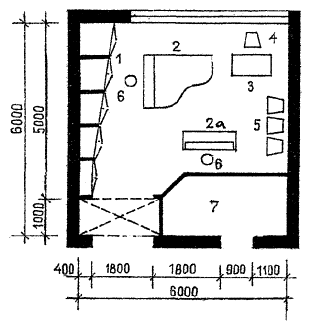 РИС. 1. ПЛАНИРОВОЧНАЯ СХЕМА КОМНАТЫ ДЛЯ ИНДИВИДУАЛЬНЫХ ЗАНЯТИЙ ПО МУЗЫКЕ С ПОДСОБНЫМ ПОМЕЩЕНИЕМ Экспликация оборудования: 1 - встроенный шкаф, 2 - рояль, 2а - пианино, 3 - стол учителя, 4 - стул учителя, 5 - стулья ученические, 6- винтовой табурет, 7 - подсобное помещение.