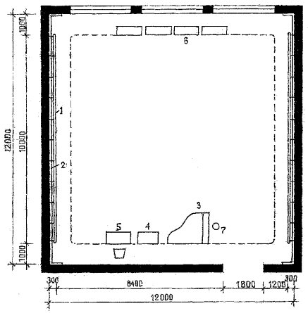 РИС. 3. ПЛАНИРОВОЧНАЯ СХЕМА ЗАЛА ДЛЯ ЗАНЯТИЙ ПО КЛАССИЧЕСКОМУ, НАРОДНО-СЦЕНИЧЕСКОМУ, ИСТОРИКО-БЫТОВОМУ, СОВРЕМЕННОМУ И БАЛЬНОМУ ТАНЦАМ Экспликация оборудования: 1 - станок балетный (перекладина), 2 - зеркало, 3 - рояль, 4 - стол для музыкальной аппаратуры, 5 - стол учителя, 6 - скамьи, 7 - винтовой табурет. |