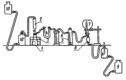где m1 - масса карбида кальция, оставшаяся на одноименных ситах или прошедшая через нижнее сито, кг; m - масса карбида кальция, взятая для определения, кг. За результат анализа принимают среднее арифметическое двух параллельных определений, допускаемые расхождения между которыми не должны превышать 0,25% при доверительной вероятности Р=0,95. Допускаемая абсолютная суммарная погрешность результата анализа ±0,3 % при доверительной вероятности Р=0,95. (Измененная редакция, Изм. № 3). 4.5. Определение объемной доли фосфористого водорода в ацетилене 4.5.1. Реактивы, растворы и аппаратура Кислота уксусная по ГОСТ 61, раствор с массовой долей 80-90 %. Йод по ГОСТ 4159, раствор концентрации с (1/2 J2)=0,01 моль/дм3 (0,01 н.), готовят по ГОСТ 25794.2. Натрий уксуснокислый по ГОСТ 199. Натрий серноватистокислый (тиосульфат натрия) по ГОСТ 27068, раствор концентрации 0,01 моль/дм3 (0,01 н.). Кислота соляная по ГОСТ 3118, плотностью 1,19 г/см3. Крахмал растворимый по ГОСТ 10163, водный раствор с массовой долей 0,5 %. Вода дистиллированная по ГОСТ 6709. Кадмий уксуснокислый, поглотительный раствор, готовят следующим образом: 27 г уксуснокислого кадмия растворяют в воде и при необходимости фильтруют. К раствору добавляют 10 см3 уксусной кислоты и 10 г уксуснокислого натрия, объем раствора доводят водой до 1 дм3 и хорошо перемешивают. Колба коническая типа КН-500-34. Колба плоскодонная типа КП-1000-34. Воронки капельные. Трубка U-образная типа КШ 14,5/23. Склянки для промывания газов по ГОСТ 25336 типа CHI-200. Бутыли с тубусом по ГОСТ 25336 вместимостью 3 и 10 дм3. Термометр ртутный стеклянный. Весы лабораторные общего назначения по ГОСТ 24104 2-го класса точности с наибольшим пределом взвешивания 200 г, допускается применение других весов с аналогичными технологическими и метрологическими характеристиками. Бюретки, пипетки по НТД, пробирки, колбы, цилиндры по ГОСТ 1770 2-го класса точности, допускается применение другой посуды при условии получения метрологических характеристик, не уступающих указанным в соответствующих стандартах. (Измененная редакция, Изм. № 2, 3). Для определения фосфористого водорода в ацетилене из карбида кальция применяют прибор (черт. 2), состоящий из: конической колбы для разложения карбида кальция вместимостью 500 см3 с присоединенной к ней капельной воронкой такой же вместимости, ванны для охлаждения колбы; U-образной трубки, заполненной стеклянной ватой и плотно закрытой пробками (газ поступает и выходит через боковые отводы); первой склянки для промывания газов; второй склянки для промывания газов, снабженной фильтром ПОР 160 или ПОР 100 по ГОСТ 25336; плоскодонной колбы, калиброванной по воде для определения фосфористого водорода, вместимостью 1 дм3 с присоединенной к ней капельной воронкой вместимостью 50-100 см3; большого аспиратора - двух бутылей с нижними тубусами вместимостью 15 дм3 каждая, соединенных между собой резиновым шлангом через тубусы, одна из бутылей плотно закрыта пробкой со вставленным в нее термометром; малого аспиратора - двух склянок с нижними тубусами вместимостью 3 дм3 каждая, соединенных между собой через тубусы. Коническую и плоскодонную колбы и одну бутыль большого аспиратора плотно закрывают резиновыми пробками с двумя отверстиями. В одно отверстие пробки конической колбы вставляют капельную воронку так, чтобы нижний оттянутый конец ее диаметром около 3 мм выступил на 5-10 мм от ниж