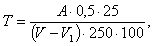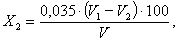 где V1 - объем раствора йода концентрации точно 0,01 моль/дм3, см3; V2 - объем раствора серноватистокислого натрия концентрации точно 0,01 моль/дм3, израсходованный на титрование избытка йода, см3; 0,035 - объем фосфористого водорода, соответствующий 1 см3 раствора йода концентрации точно 0,01 моль/дм3, см3; V - объем ацетилена, см3, равный объему плоскодонной колбы и приведенный к 101325 Па (760 мм рт. ст.) и 20 °С по формуле