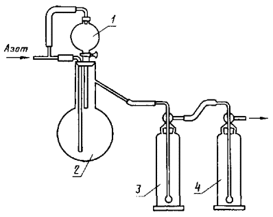 где VK - объем колбы, см3; Р - атмосферное давление, Па (мм рт. ст.); Wt - упругость паров воды при температуре t, Па (мм рт. ст.); P0 - нормальное давление составляет 101325 Па (760 мм рт. ст.); t - температура газа при проведении определения, °С. За результат анализа принимают среднее арифметическое двух параллельных определений, допускаемые расхождения между которыми не должны превышать 0,004% при доверительной вероятности Р=0,95. Допускаемая абсолютная суммарная погрешность результата анализа ±0,004 % при доверительной вероятности Р=0,95. (Измененная редакция, Изм. № 2, 3). 4.6. Определение массовой доли сульфидной серы 4.6.1. Реактивы, растворы и аппаратура Кислота соляная по ГОСТ 3118, плотностью 1,12 г/см3. Кислота уксусная по ГОСТ 61, х. ч., раствор с массовой долей 80-90 %. Йод по ГОСТ 4159, раствор концентрации с (1/2 J2)=0,1 моль/дм3 (0,1 н.), готовят по ГОСТ 25794.2. Натрий уксуснокислый по ГОСТ 199. Кадмий уксуснокислый, раствор готовят по п. 4.5.1. Натрий серноватистокислый (тиосульфат натрия) по ГОСТ 27068, ч. д. а., раствор концентрации 0,1 моль/дм3. Крахмал растворимый по ГОСТ 10163, водный раствор с массовой долей крахмала 0,5 %. Вода дистиллированная по ГОСТ 6709. Колба круглодонная с боковым отводом. Воронка капельная. Склянка для промывания газов по ГОСТ 25336 типа CHI-200. Весы лабораторные общего назначения по ГОСТ 24104 2-го класса точности с наибольшим пределом взвешивания 200 г; допускается применение других весов с аналогичными техническими и метрологическими характеристиками. Прибор для выделения сульфидной серы 1 - капельная воронка; 2 - реакционная колба с боковым отводом; 3, 4 - склянки для промывки газов Черт. 3 Бюретки, пипетки по НТД, пробирки, колбы; цилиндры по ГОСТ 1770 2-го класса точности; допускается применение другой посуды при условии получения метрологических характеристик, не уступающих указанным в соответствующих стандартах. (Измененная редакция, Изм. № 2, 3). 4.6.2. Подготовка к анализу Сульфидную серу из навески карбида кальция выделяют в приборе (черт. 3), состоящем из широкогорлой колбы с боковым отводом для разложения карбида кальция вместимостью 100 см3 с хорошо пригнанной резиновой пробкой, в которую вставлена капельная воронка для соляной кислоты и барботер для подачи азота. Боковая отводная трубка колбы присоединяется с помощью резиновых шлангов к склянкам для промывания газа. Перед определением кран капельной воронки смазывают вазелином, в склянки 3 и 4 наливают по 30-40 см3 раствора уксуснокислого кадмия. 4.6.3. Проведение анализа 1-1,5 г карбида кальция, приготовленного по п. 4.2.5, взвешивают, результат взвешивания в граммах записывают с точностью до третьего десятичного знака, помещают в реакционную колбу и проверяют прибор на герметичность. Для этого перекрывают винтовым зажимом линию подачи азота. К склянке 4 подсоединяют аспираторную склянку, закрытую пробкой со вставленным двухходовым краном. Эта склянка через тубусное отверстие соединена с другой склянкой, установленной ниже. В склянках находится дистиллированная вода. Открывают двухходовой кран аспиратора. Жидкость в верхней склянке вначале опускается, а затем устанавливается на постоянном уровне. Если система герметична, отсоединяют аспираторные склянки, вынимают пробку, закрывающую капельную воронку, и наливают в капельную воронку 15-20 см3 соляной кислоты, закрывают воронку пробкой, ослабляют винтовой зажим на линии 