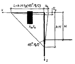 перемещение где φП - средневзвешенное расчетное значение угла внутреннего трения грунта в градусах для расчетов по второй группе предельных состояний. Для ограждающих конструкций, работающих по консольной схеме, допускается принимать линейный закон распределения горизонтальных перемещений стены по глубине. В этом случае величины перемещений точки фундамента с координатами x0,z0 определяются выражениями: осадка горизонтальное