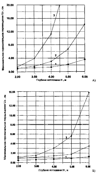 перемещение где u0 - горизонтальное перемещение верха ограждающей конструкции; Н - глубина котлована; k - безразмерный коэффициент, принимаемый в зависимости от грунтовых условий равным 1,3 - для песков, 1,2 - для суглинков и супесей, 1,1 - для глин. Рис. 5.1 Графики для определения расстояния между фундаментами, при котором учитывается влияние нового строительства. А) - для квадратного фундамента; Б) - для прямоугольного фундамента. 1 - р=0,1 МПа; 2 - р=0,2 МПа; 3 - р=0,3 МПа. Рис. 5.2 Схема для определения осадок и горизонтальных перемещений фундаментов вблизи подкрепленных котлованов Справочные величины перемещений верха и0 консольной ограждающей конструкции для различных грунтовых условий в зависимости от глубины котлована и типа конструкции приведены на рис. 5.3. Величины и0, соответствующие промежуточным значениям изгибной жесткости ограждающей конструкции, для предварительных расчетов допускается определять интерполяцией. Полученные значения и0, вычислены для полной глубины ограждающей конструкции равной 2Н и с учетом поверхностной равномерно распределенной нагрузки равной 10 кПа. Уровень подземных вод во всех расчетах принимался ниже дна котлована, нагрузка, передаваемая зданием, не учитывалась. Для определения перемещений фундаментов существующих зданий, не попадающих в призму активного давления грунта, следует выполнять математическое моделирование согласно п. 5.10. Рис. 5.3