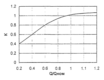 Величину КПД насосного агрегата hнс определяют как hнс = К hдв.ном, где К - определяют по графику рис. 6 для расхода Qcp, измеренного в п. 4 и отнесенного к Qном из п. 1. Рис. 6. 8. Определяется стоимость годовой экономии электроэнергии, руб./год по формуле: