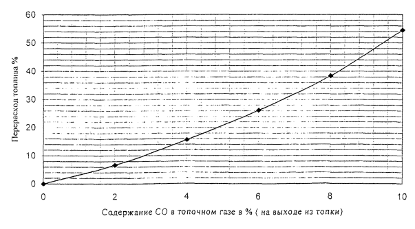 Рис. 15. Влияние содержания СО (химический недожег) в топочном газе на перерасход топлива (газ, нефть). Более точные результаты получают при проведении тепловых балансовых испытаний котельных агрегатов, которые проводятся специальными лицензированными организациями. Испытания ограничиваются 3-4 наиболее характерными режимами: 50, 70, 90 и 100% номинальной производительности при соблюдении заданных параметров теплоносителя и питательной воды. При испытаниях проводится осмотр котла и вспомогательного оборудования, определяется засоренность золой поверхностей теплообмена, наличие отложений, накипи. (Отмеченные недостатки устраняются до начала испытаний, что оформляется соответствующим актом).